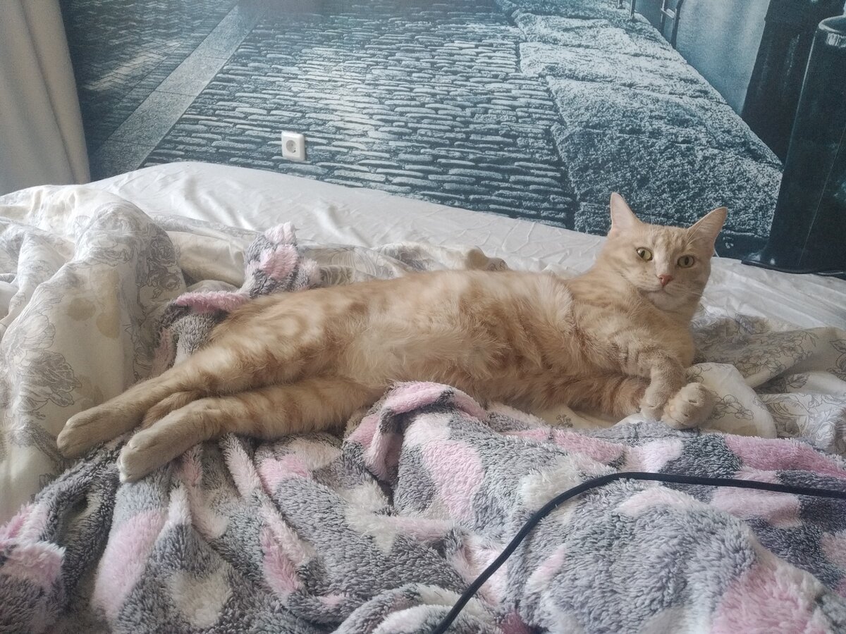Кот не собирался быть вежливым. Он ходил вокруг кровати, точнее, его вздёрнутый хвост, (я видела только его) и вопил. О, сколько же было страданий в этом голосе! В конце концов, смирился и улегся, но от его взгляда мне становилось не по себе))