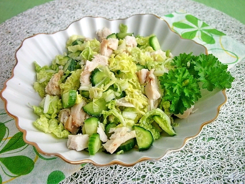 Изготовление легкого салатика из пекинской капусты с копченой курицей и огуречком