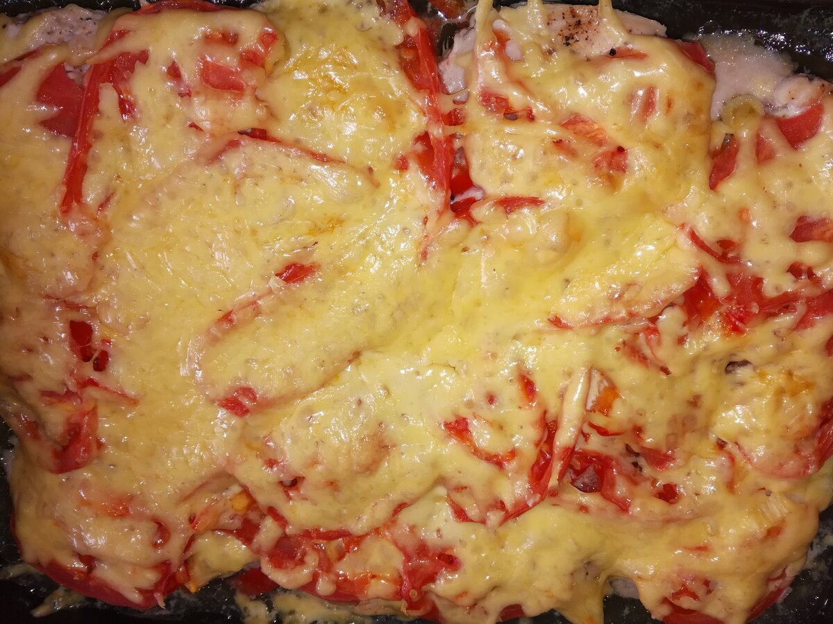 Потребуется на 6-8 порций Куриное филе 3 штуки Сыр твердый 200 гр Болгарский сладкий перец 1 штука Помидор 1 штука Лук 1 маленькая штука Чеснок 2-3 зубчика Соль 0,5 столовой ложки Перец 0,5 чайной ложки (у меня смесь перцев) Масло растительное для смазывания формы 0,5-1 столовая ложка Итого 400 рублей По желанию можно добавить картофель, нарезанный тонкими кольцами, положив его самым первым слоем. Лук нарезаем полукольцами. Сладкий перец кубиками. Куриное филе нарезаем и слегка отбиваем. Присыпаем солью и выкладываем в форму, смазанную растительным маслом. Сверху присыпаем перцем. Сверху распределяем измельченный чеснок и лук. Равномерно распределяем болгарский перец. Сверху выкладываем помидор , нарезанный кружочками. Сыр натираем на средней терке и равномерно присыпаем сверху. Натертый сыр можно смешать с майонезом. Ставим в разогретую до 180 градусов духовку на 50 минут. Приятного аппетита! Ставьте лайки, подписывайтесь на канал "Простые рецепты", будем творить вместе)