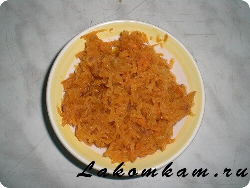 Салат «Вкусненький». Приготовление. Морковь натереть на мелкой тёрке и обжарить на сковороде: