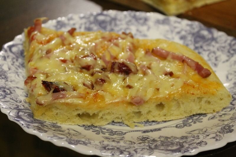 Вторым скоромным блюдом была "пицца", вернее "Пиццевый пирог". Обычное дрожжевое тесто, про которое мы неоднократно писали в наших заметках и начинка, как для пиццы с ветчиной.
