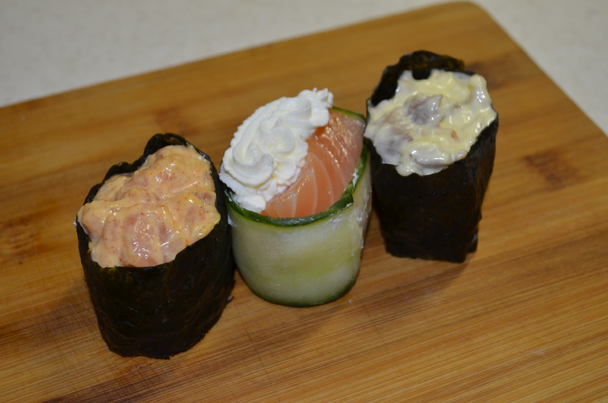 Всего из полоски нори, шарика риса и несложной начинки, создается феерия вкуса. При правильном подборе компонентов, каждый гункан будет иметь свой неповторимый вкус. Как приготовить соусы для гункан вы можете посмотреть в этой статье. Так же, вспомните как готовиться рис для суши. Гункан-суши очень просты в приготовлении. В начинку для гункана вы можете добавить, что угодно, от икры лосося или летучей рыбы до креветки и угря. Посмотрите, 3 моих любимых сочетания. Гункан с начинкой из угря в чесночном соусе. Для приготовления вам понадобится: Полоска нори Шарик риса Угорь Чесночный соус Приготовим начинку. Перемешаем нарезанного угря с чесночным соусом. Сделайте рисовый шарик, из приготовленного риса. Отрезаем от листа нори полоску шириной 3-3,5 см. Обмотаем рис полоской из нори, скрепляем рисинкой или капелькой сливочного сыра. Вдавливаем рис плотно, чтобы рис и нори были прижаты друг к другу. В получившуюся лодочку выкладываем начинку. Гункан со сливочным сыром и семгой, с огурц