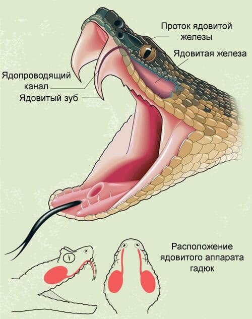В височной части змеи головы находятся железы, вырабатывающие яд.от этих желез яд по каналу выступает в два трубчатых зуба, расположенных в верхней челюсти. У некоторых замедленное этих зубов достигает 4-5 сантиметров. Когда такая змея находится в спокойном состоянии, её зубы прижаты к нёбу наподобие складного ножика. Моменты курсы зубы выпрямляются и выдвигаются вперёд. При этом змея наносится с их помощью молниеносный удар. Укол зубы находится глубоко в постели достигает длины всего 6-7 миллиметров. Чтобы поразить жертву, кобра широко открывает пасть, хватает добычу и разжевывает её. Если змея случайно сломает ядовитые зубы, на их вместе вырастают новые.