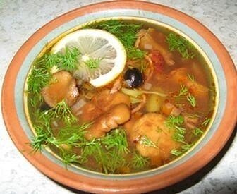 Грибная солянка 1 кочан капусты (1-1,5 кг), 500 г любых грибов, 3 ст. л. растительного масла, 2 луковицы, 2 ст. л. томата-пюре, 1 ст. л. 3-процентного уксуса, 1 ст. л. сахара, 1 ст. л. муки, 2 лавровых листа, 1/2 стакана грибного бульона, черный молотый перец, соль по вкусу. Очищенные и промытые свежие грибы ошпарить кипятком и обжарить на сковороде вместе с луком, нарезанным тонкими кольцами. Очищенную капусту нашинковать, положить в кастрюлю, добавить столовую ложку масла, 1/2 стакана грибного бульона или воды. Далее я накрываю кастрюлю крышкой и тушу капусту 40 мин. Затем положить поджаренные с луком грибы, томат-пюре, уксус, сахар, соль, лавровый лист, перец и продолжать тушить до готовности еще 10 мин. Приятного