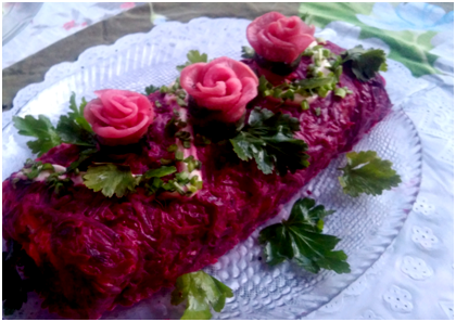 Ах, как хороша селедочка под шубой! И в будни ее отведать не прочь, и на праздничном столе лишней не будет. Блюдо, которое вместе салатом «Оливье» ассоциируется у наших граждан с праздниками вообще и с новым годом в частности. Появившаяся в 60-70 годах прошлого века, актуальна шубка и сегодня. Делают ее с добавлением яблока, яиц и даже соленых огурцов. Неизменным остается лук, картошка, морковь и свекла. Их сочетание с жирной соленой сельдью придает блюду особый неповторимый вкус. Сегодня мы будем готовить не привычную всем селедочку под шубой, а царскую шубку. Для этого нам понадобятся вышеперечисленные ингредиенты, а вместо сельди – красная рыба – семга или форель. И баночка красной икры. Количество продуктов зависит во многом от размера блюда, на которое мы будем выкладывать слои, или делать рулет. Я взяла 1 крупную свеклу, 3 моркови, 4 картошки, 1 большую луковицу, 200 грамм форели, майонез. Если вы добавляете яйца, то 4 штук будет достаточно. Замаринуем лук, почистим и натрем