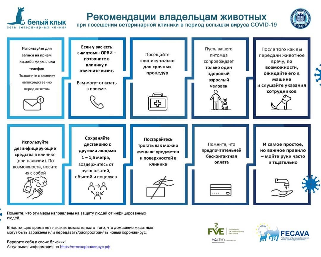 Отличная переведенная инфографика от клиники Белый клык о том, как посещать ветеринарную клинику во время пандемии: 1. Используйте для записи на прием онлайн-формы или телефон Лучше прийти к врачу по записи, чем сидеть в общей очереди. Позвоните в клинику, чтобы записаться на прием или отменить, если вы заболели или поменяли планы. 2. Если у вас есть симптомы ОРВИ - отмените визит. Не приходите в ветеринарную клинику, если у вас есть симптомы ОРВИ, позвоните и отмените прием или, если случай неотлагательный, попросите родных или друзей отвезти собаку или кошку в клинику. Людям с симптомами ОРВИ в клинике могут отказать в приеме. 3. Посещайте клинику только для срочных процедур. Если вашему питомцу нужно постричь когти, почистить зубы, или вы запланировали его кастрировать - отложите посещение клиники до окончания пандемии. 4. Пусть вашего питомца сопровождает только один здоровый взрослый человек Семейный выход в клинику - хоть и не распространенное явление, однако вполне обыденное. Лу