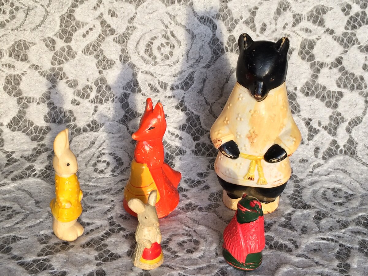 Эти фигурки по сказке "Теремок" из так называемого колкого пластика были очень распространенными. Несмотря на это, собрать полный набор не так-то просто. Мне, например, пока не попадался волк.