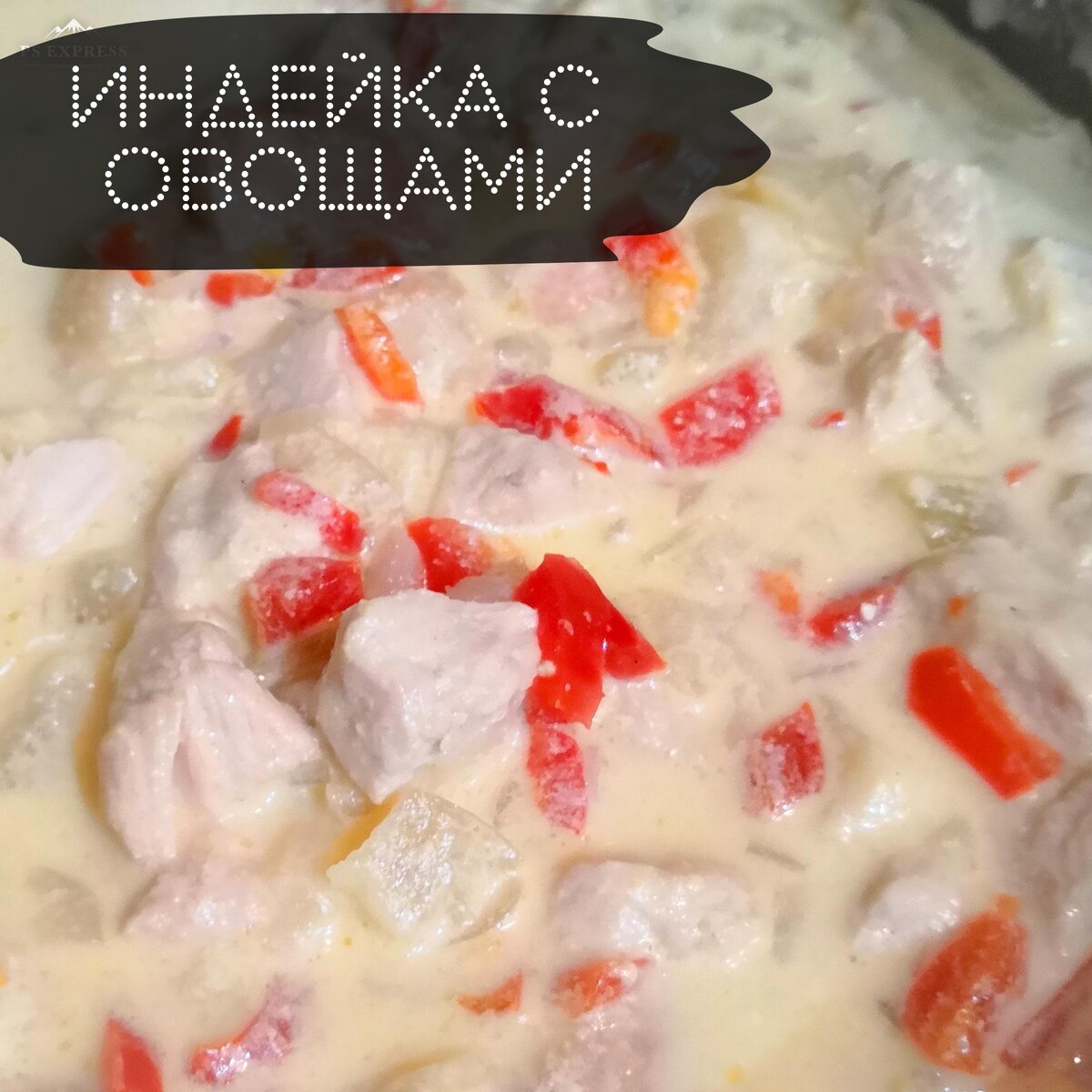 БЫСТРЫЙ И ВКУСНЫЙ УЖИН ЗА 30 МИНУТ.... Тушёная Индейка с овощами Индейка 350 гр. Перец сладкий красный 2 шт. Лук репчатый 2 шт. Чеснок 4 зубчика Кабачок 1/2 шт. Сметана 100 гр. Вода 100 мл. Паприка 1 ч.л. Соль по вкусу Смесь специй по вкусу Масло растительное для жарки Укроп по вкусу Вам понадобится: Нарезать грудку индейки. Обжарить на растительном масле в течении 15 минут, помешивать. Добавить нарезанный лук и чеснок. Сразу добавить и перец, перемешать. Обжаривать 10 минут. Далее добавить кабачок, нарезанный кубиком. Продолжать обжаривать. Через 7 - 8 минут добавить соус. В миске смешать сметану с майонезом, добавить 100 мл. теплой воды. Мясо посыпать специями. Перемешать. Тушить 5 - 7 минут на минимальном огне под крышкой