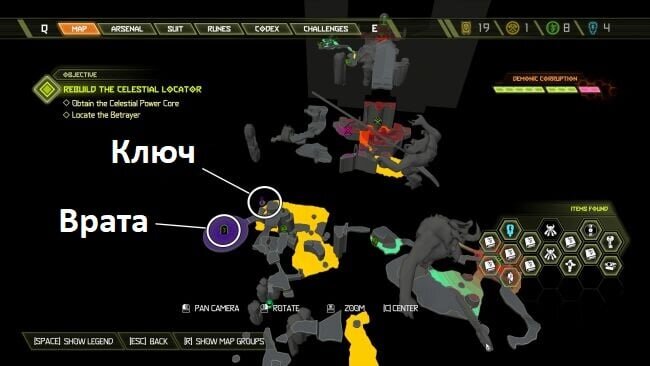 Ключ Палача: находясь у Врат, вернитесь в главную комнату, откуда виден ключ, затем повернитесь к нему. Заверните налево в комнату управления и нажмите кнопку на панели. После этого стоит разобраться со всеми демонами, появившимися в соседней комнате, чтобы они не мешали.