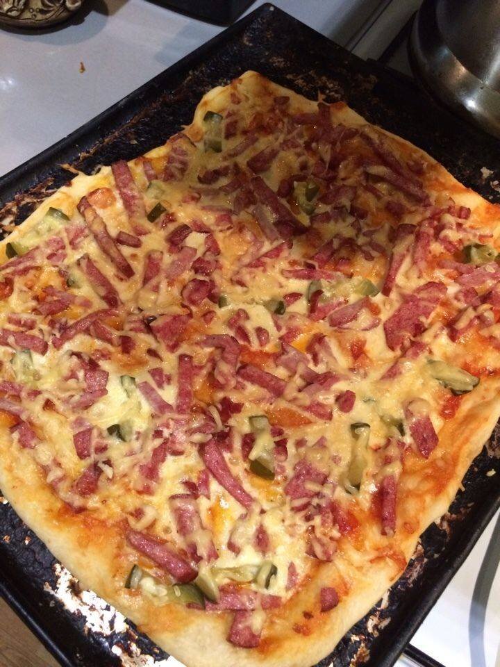 Пицца с тонким слоем теста, как из пиццерии, и с очень бюджетной начинкой. К концу недели в холодильнике остаются продукты "по чуть-чуть". Из них можно приготовить вкусную пиццу. Начинка может быть разной - грибы, фарш, капуста и т.д. Но т.к. не все члены семьи едят ВСЁ, то я выбрала самый оптимальный рецепт начинки. Можно, конечно и "по-богаче", но я хочу показать как можно накормить семью из того что нашлось! Рецепт на одну пиццу. Ингредиенты 3.Соленный огурец - произвольно. 4.Сыр натереть на крупной терке. Вот столько нашлось в холодильнике, и этого хватит! 5.Нарезать мелко лук, чеснок и обжарить на растительном масле до золотистого цвета. Затем добавить томатную пасту, помешать и 2-3 сек, припустить и добавить воды, примерно 3 ст.л.. 6.Добавить разные специи по желанию, я люблю острый перец и припустить соус примерно 4 мин., чтобы он немного загустел. 7.Теперь самое интересное! Яйцо + майонез + соль, перец, можно добавить чеснок - взбить вилочкой. Это и есть секрет эко