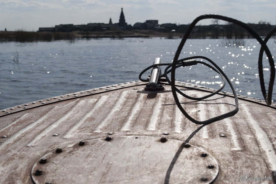Петропавловская церковь почти видна с трассы М-8, а может видна и хорошо, если ехать медленно. Находится она в селе Погост (Ратонаволок). Туда мы и направляемся... Деревня совсем недалеко от федеральной трассы, рядом с крупным населенным пунктом, но добраться сюда не так просто. Раньше, чтобы преодолеть речку, можно было воспользоваться понтонной переправой. Сейчас ходит лишь небольшой катерок с жутко неудобным расписанием. На фото остатки переправы, катер-паром и казанки аборигенов, на заднем фоне - Емецк. Делать нечего, пришлось ловить местных жителей и местных клещей. Один из "правобережников" приехал на левый берег забрать детей, воротившихся из школы (да-да, детей отправляют из левобережных деревень в школу). Акен и месекет были найдены. Можно в путь. Половодье во всей красе Берег у деревни песчаный, замечательный. Летом в деревне много дачников, такой своеобразный северный рай. Все три искомые церкви передо мной - церковь Петра и Павла (слева) и полуразрушенные