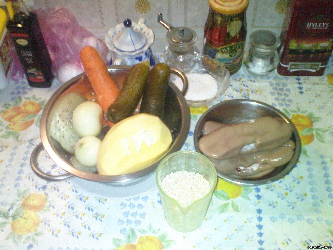 Теперь шинкуем овощи. Лук кубиками, морковь брусочками или крупно трем, огурцы кубиками. Эта вся красота пойдет в зажарку. Сначала обжариваем лук, потом добавляем морковку, ну и последними засыпаем огурцы, ну и поперчить, посолить тоже не помешало бы, только осторожно - не забываем: огурцы уже соленые! Мясо-почки уже сварились, потому засыпаем крупу и порезанную кубиками картошку. А когда будут готовы и они, добавляем и зажарку. Немного провариваем и, выключив под кастрюлей огонь, даем рассольнику хорошо настоятся.