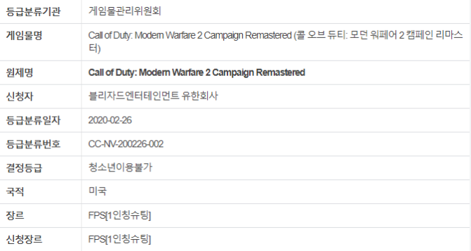 В марте прошлого года на сайте рейтингового агентства Европы засветился ремастер Call of Duty: Modern Warfare 2. Спустя чуть больше года игра появилась уже на сайте южнокорейской комиссии. Как и раньше, речь идет только о сюжетной кампании. Шутер получил рейтинг "18+" еще 26 февраля, но журналисты обратили внимание на находку только сейчас. В прошлом ремастер первой Modern Warfare продавался вместе с Infinite Warfare. Не исключено, что переиздание сиквела выйдет одновременно с Call of Duty 2020, которая, по недавним слухам, будет перезапуском серии Black Ops про Вьетнам.