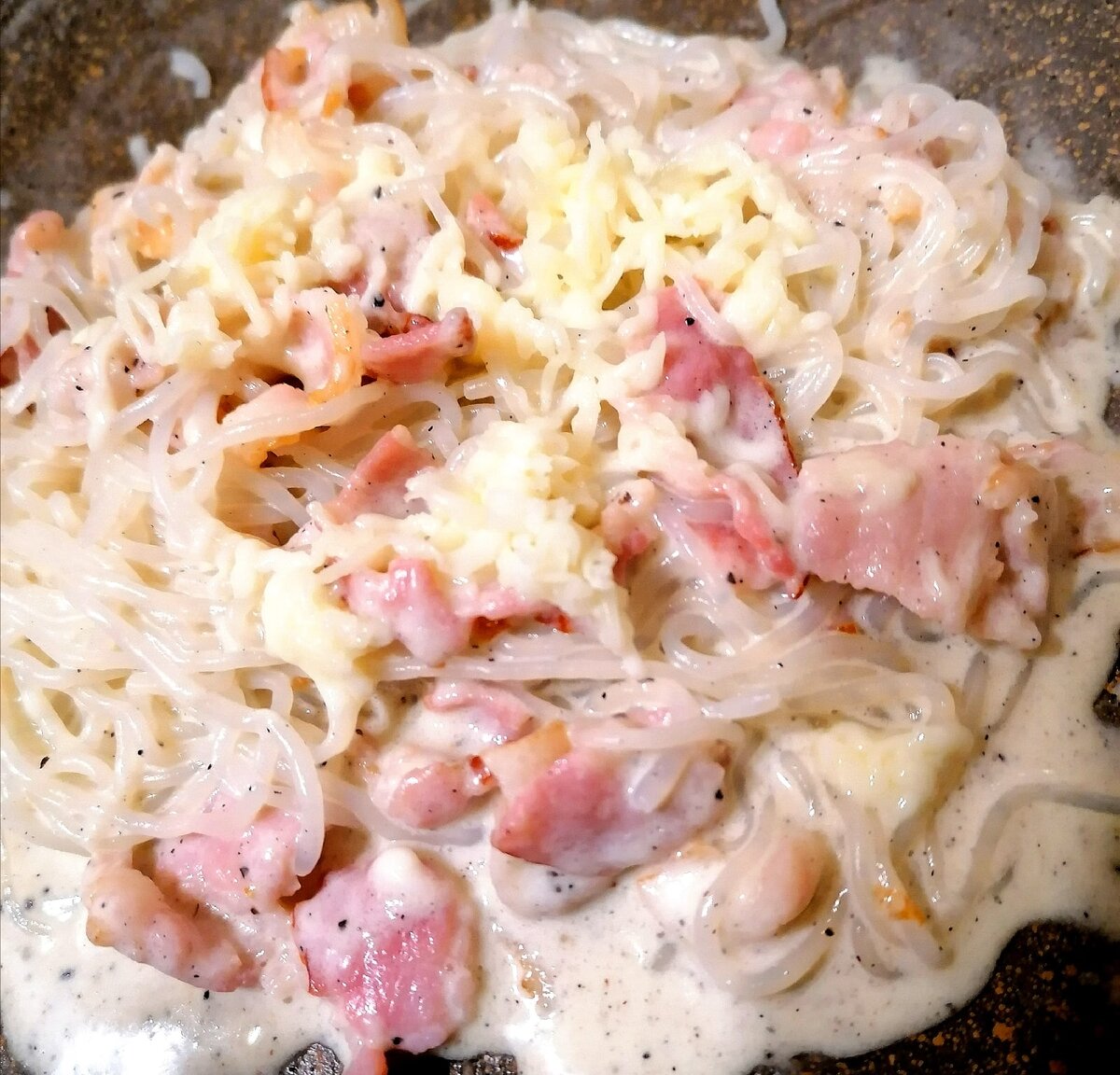 2) Промываем лапшу под проточной водой и отправляем на сковороду к бекону. Солим и перчим по вкусу.
