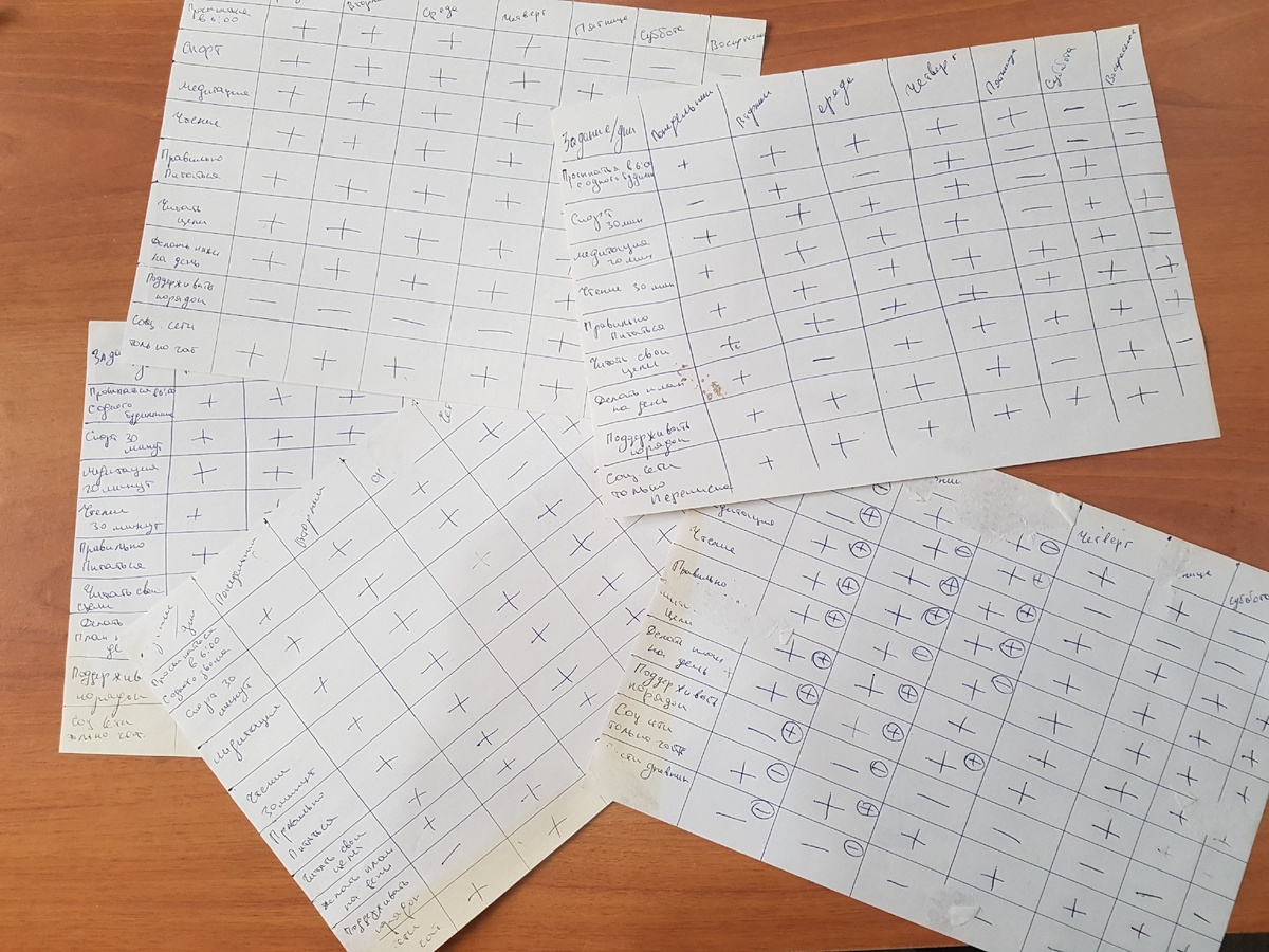 Наверное, каждый пытался привить себе какую-то привычку. А бывало ли у вас, что вы хотите привить себе сразу несколько привычек? И они могла быть даже не связанны между собой. Может быть вы бросали курить тут же хотели следить за своими финансами и научиться играть на гитаре. Или вы понимали, что совсем забросили саморазвитие и включали в свой список сразу с десяток новых привычек и пытались их себе привить? Лично у меня бывало именно так. Я постоянно стремился в себе что-то улучшать. Но только я погружался в одно, забывал про другое. Затем забывалось и это. Пару лет назад я составил список из своих планов на день, который должен был выполнять каждый день. И по началу у меня получалось, но проходил месяц и весь план плыл. Две недели бездействий, и я брался опять за него. И снова рецидив. Фото моего плана будет ниже. На тот момент я считал, что это лучший подход. Я каждую неделю писал свой график и вешал на стену. Приятно было чувствовать в конце первой недели, что у тебя все плюсики