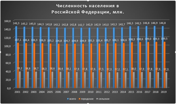 Численность Численность населения Российской Федерации на 2020 год еще предстоит подсчитать точно, но данные за прошлые года можно привести. Все нижеприведенные данные, это данные Росстата. Но у меня некоторые из них вызывают вопросы. Например. В первой диаграмме мы видим, что в последние пять лет численность постоянно проживающего населения в России стабилизировалось на отметке в 146 миллионов. И это хорошо. Наверное все таки играют роль все меры, которые государство предпринимает по поддержанию демографии. Прирост Но во второй диаграмме, опять же по данным Росстата, прирост численности населения в 2018 году оказался отрицательным. Чего не скажешь по первой диаграмме, где в этот год наблюдается прирост. Кто-то где-то ошибся) Прогноз Теперь вопрос по прогнозам Росстата. Как видно по третьей диаграмме, в течении десяти следующих лет население станет сокращаться почти на миллион в год. Наверное они рассчитывают по определенной методике, но судя по их же данным ( в первой диаграмме