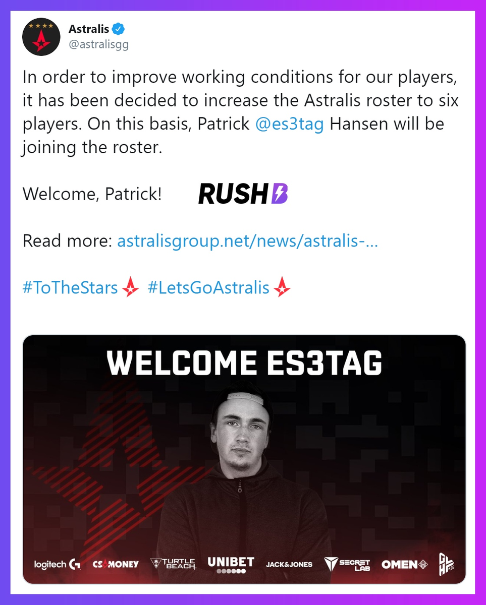 Патрик «es3tag» Хансен официально стал игроком Astralis! Одна загвоздка, контракт es3tag'a начнется действовать с 1-го июля, и именно тогда состав Astralis увеличится до 6-ти игроков. С приходом 24-летнего игрока у Astralis появится возможность улучшить условия труда других участников команды, они смогут брать отпуск, чтобы восстановиться в физическом или психологическом плане. Учитывая, что контракт Патрика истекает 1-го июля, а сейчас весь коллектив Heroic пытается подписать организация FunPlus Phoenix, можно утверждать, что Astralis поставили под угрозу завершение данной сделки. Ранее мы уже писали, что в комментарии для портала HLTV, CEO Heroic сообщил, что компания работает над этим вопросом с юристами. Но, учитывая, что контракт es3tag'a с Astralis уже подписан и начинает действовать с 1-го июля, вряд ли у него получится как-то это отменить. В результате, организация Astralis получила шестого игрока в свою команду абсолютно БЕСПЛАТНО, не заплатив ни единого доллара. Да, им