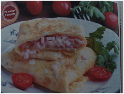 Утром обязательно нужно что-то покушать. Тогда и день пройдет успешно. А хочется что-нибудь вкусное. Тогда можно на завтрак приготовить омлет. Яичные конвертики с ветчиной Ингредиенты: Яйца 5 шт. Ветчина – 100гр Сыр твердый – 100гр Растительное масло – 2 ст. л. Соль, перец - по вкусу Яйца по солить, по перчить , взбить венчиком до однородной массы. Ветчину нарезать кубиками, сыр натереть на мелкой терке. В сковороде разогрейте растительного масла, влейте ¼ часть яичной смеси, распределите её по сковороде. Готовьте, пока верх омлетного блинчика не схватится, затем переверните с помощью лопатки. Положите в середину блинчика ветчину и сыр, затем края заверните конвертиком. Прижмите края лопаткой чтобы они склеились при помощи сыра. Переверните конвертик и готовьте 1 минуту. Выложите на тарелку. Приготовьте ещё 3 конвертика таким же образом. Овсяный омлет с овощами. Ингредиенты: яйца 6 шт. Помидоры чери 5 шт. Перец болгарский 1 шт. Брокколи 150гр. Молоко 4 ст.л. Овсяные хлопья