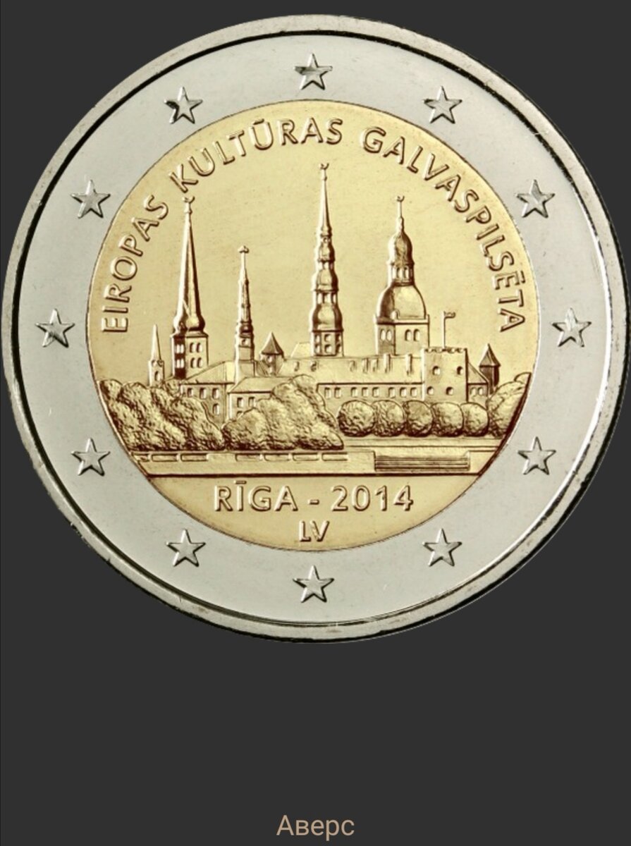 2 евро, Латвия (Рига — Культурная столица Европы) ТИРАЖ: 1000000 UNC , 5000 BU(сoincard) НОМИНАЛ - 2 ЕВРО МАТЕРИАЛ - БИМЕТАЛЛ (центр - латунь, кольцо - медно-никелевый сплав) МАССА - 8,5 гр. ДИАМЕТР - 25,75 мм. ТОЛШИНА - 2,2 мм. ДАТА ВЫПУСКА - 12.08.2014 МОНЕТНЫЙ ДВОР - Монетный двор Штутгарта На внутреннем диске изображён исторический центр Риги. Над панорамой возвышаются (слева направо): церковь св. Иоанна, собор св. Иакова, башня Рижского замка, башня церкви св. Петра и Рижский Домский собор. На переднем плане стена и укрепления Рижского замка. Текст вдоль верхнего края диска: «EIROPAS KULTŪRAS GALVASPILSĒTA» («КУЛЬТУРНАЯ СТОЛИЦА ЕВРОПЫ»), внизу — название города и год эмиссии «RĪGA — 2014», ещё ниже — обозначение государства-эмитента «LV». По кругу внешнего кольца расположены 12 звёзд. Историческая справка: Целью программы «Культурная столица Европы» является сплочение жителей континента на базе сотрудничества в области культуры, упрощение культурного, экономического, и политич