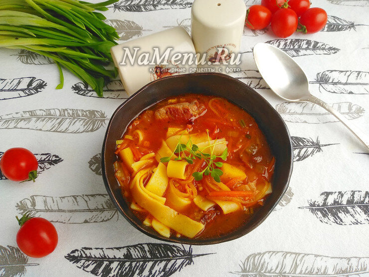 🍅Помидор надрезать крестообразно, ошпарить. Очистить от кожуры и нарезать мелкими кусочками. Ввести в лагман варить 20 минут