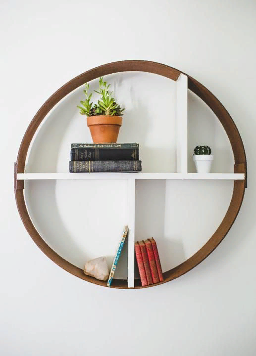 Круглая форма полочки – необычное и стильное решение для тех, кого особо не волнует как разместить на ней вещи и сохранить пространство. Самый доступный материал, который и достаточно прочен, и легко гнется – это лист ДВП. Из него выпиливают две полосы расчетной длины (l). Параллельно подготавливают также доску желаемой длины в качестве центральной полочки. Очевидно, что все эти детали должны иметь ту же ширину. Теперь о длине полосок. С точки зрения геометрии, центральная полочка является диаметром (d) внешнего контура будущего круга, а полосы, соответственно половиной длины контура, поэтому они зависят друг от друга и связаны между собой формулой – l=3.14 х d/2. Допустим, размеры доски – 150 на 700 мм, тогда длина полукруга будет равна 3,14х700/2, то есть 1100 мм. Теперь подсчитаем длину полос ДВП с учетом их нахлеста, скажем, в 70 мм: 1100 + 2х70 = 1240 мм. С точки зрения геометрии, центральная полочка является диаметром (d) внешнего контура будущего круга, а полосы, соответств