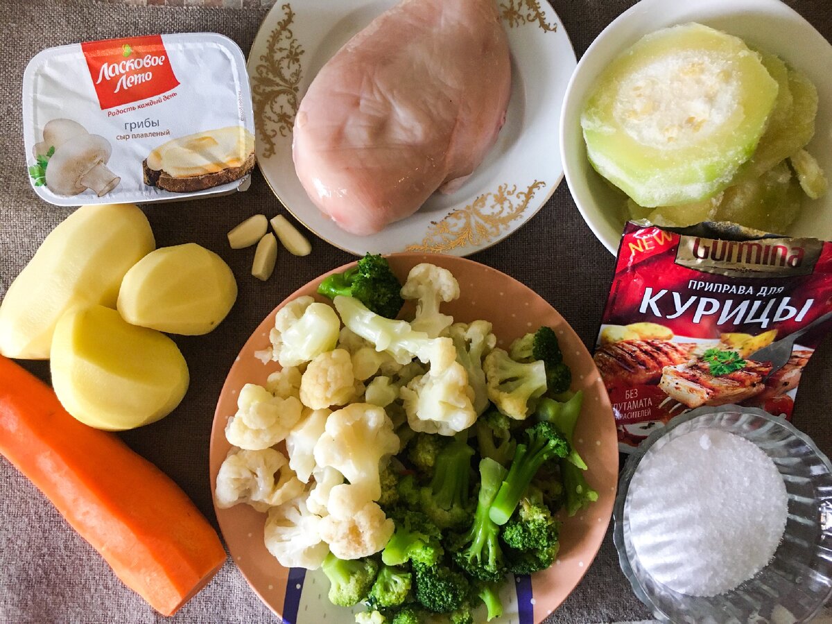 Ингредиенты: Отвариваем курицу, снимаем шум. Затем забрасываем очищенный и измельчённый картофель и морковь в бульон. Варим ещё 15 минут. Достаём курицу и даём остыть. Смесь овощей обжариваем на растительном масле минут 5, затем забрасываем в кастрюлю. Варим ещё 10 минут. Далее добавляем измельченную курицу, соль, специи и плавленый сыр. Варим ещё 10 минут. А затем измельчаем всё погружным блендером.