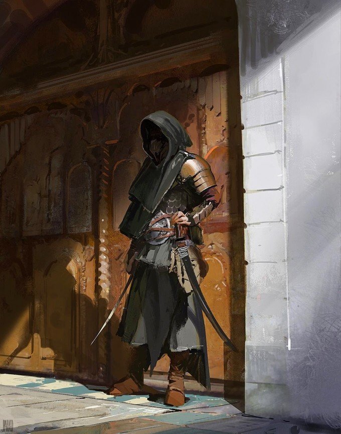 Убийца стоял возле Бронзовых ворот, ведущих с рыбного рынка в ряды ткачей. Словно статуя, он замер у стены - голова покрыта капюшоном, правая рука лежит на рукояти сабли, левая отведена за спину и покоится на кожаном пенале кривого пешкабза, на поясе. Металлическим наплечником и лёгким пластинчатым доспехом в этом городе никого не удивишь.