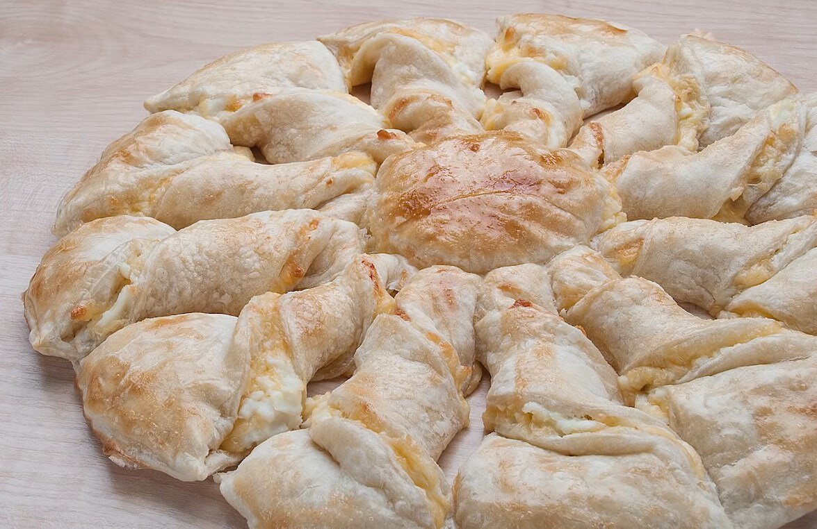 Вкусная и оригинальная закуска из слоеного теста, сыра и пары яиц. Пошаговый рецепт.