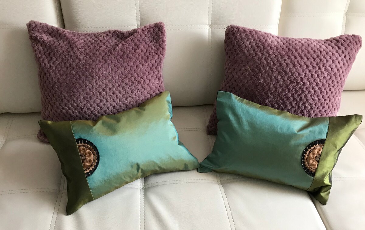 Очень люблю всевозможные подушечки. Есть у меня и сшитые и связанные, есть и купленные. Вот эти два фиолетовых чехла куплены ,уже и не вспомню в каком магазине, а две зелененькие сшила сама. Это были салфетки , привезенные подругой из Китая. Они двусторонние. В качестве праздничных салфеток они мне не подошли ( у меня для праздничного стола льняная скатерть и салфетки из льна). Не долго думая, вспорола , набила синтепухом и зашила отверстия. В качестве подушечек очень хорошо смотрятся. Был моток пряжи Alize Puffy , связала чехол на подушку, а подушка мелковата для чехла, сделала мешочек. Подумала так можно пижамницу связать. Свяжу племяннику . Эти подушки сшиты из остатков шторной ткани, чтобы не заморачиваться с молнией , сделала нахлест , как на обычных наволочках Вот таким образом Эту подушку- котика, подарила подруга, но мне он показался очень грустным. Пришила ушки из фетра, так он кажется веселее .))) Или мне одной так кажется? Эти две подушечки привезла из Турции,