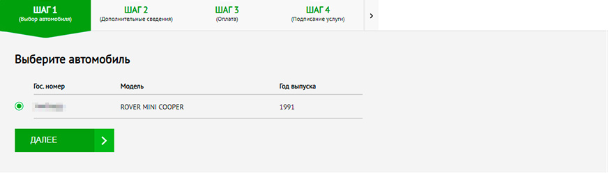 2. В открывшемся поле «Шаг 1» выбрать автомобиль из списка зарегистрированных на физическое лицо машин. Жмём «Далее».