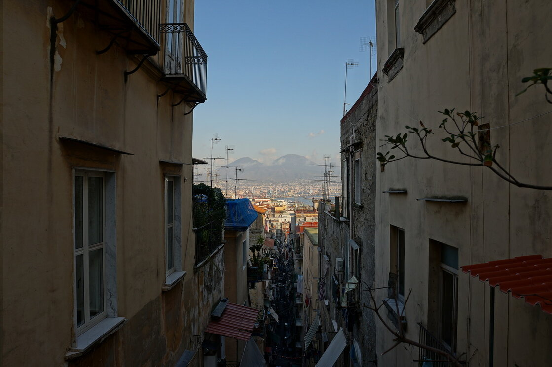 Улица Vico San Sepolcro,на верхней фотографии - это относительно новая улица Неаполя, по сравнению со многими. Она относится к району, называемому Испанские кварталы. Испанские кварталы являются одними из наиболее характерных районов бьющегося сердца Неаполя. Они на протяжении веков примыкают к всегда оживленной и многолюдной Виа Толедо, которая образует границу между двумя пространствами города с совершенно разными строениями и историей. Испанские кварталы представляют из себя сложную квадратную сеть улиц, немного темноватую, учитывая близость и размер зданий, что похоже на город в городе. Область почти не менялась с течением времени. Появлению кварталов Неаполь обязан прибытию Дона Педро Толедского В 1532 году, который являлся верным советником короля Карла V. Дон Педро спроектировал территорию, сильно отличающуюся от остальной части города по форме, для размещения солдат и офицеров испанской армии. Шесть улиц испанского квартала идут параллельно Виа Толедо и намного больше перпен