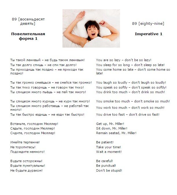 Английский язык. Урок 1. Английский язык. Урок 88. Добрый день! Продолжим изучение английского языка. Английский язык. Урок 89. 89 (восемьдесят девять) - 89 (eighty-nine) Повелительная форма 1 - Imperative 1 Ты такой ленивый – не будь таким ленивым! - You are so lazy – don’t be so lazy! Ты так долго спишь – не спи так долго! - You sleep for so long – don’t sleep so late! Ты приходишь так поздно – не приходи так поздно! - You come home so late – don’t come home so late! Ты так громко смеёшься – не смейся так громко! - You laugh so loudly – don’t laugh so loudly! Ты так тихо говоришь – не говори так тихо! - You speak so softly – don’t speak so softly! Ты слишком много пьёшь – не пей так много! - You drink too much – don’t drink so much! Ты слишком много куришь – не кури так много! - You smoke too much – don’t smoke so much! Ты слишком много работаешь – не работай так много! - You work too much – don’t work so much! Ты так быстро ездишь – не езди так быстро! - You drive too fast – don’t d