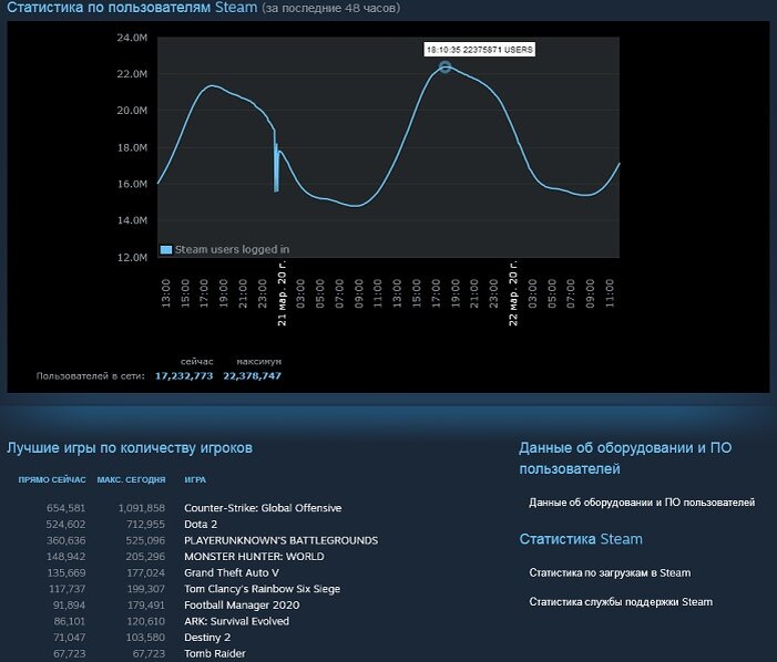 Пока коронавирус и сопутствующие ему принудительные и добровольные карантины изо всех сил бьют по различным отраслям производства и сфере услуг, индустрия видеоигр явно и закономерно наблюдает подъём. Не успел Steam на прошлой неделе установить «юбилейный» рекорд в двадцать миллионов находящихся в сети пользователей одновременно, как вчера вечером данный показатель превысил 22 миллиона пользователей. Что касается десятки игр-лидеров по популярности в Steam, то она относительно стабильна, разве что на момент написания данной заметки на десятой позиции «топа» располагалась Tomb Raider (2013), которую вместе с четырьмя другими, куда менее известными играми, вплоть до 24 марта раздают в Steam бесплатно.