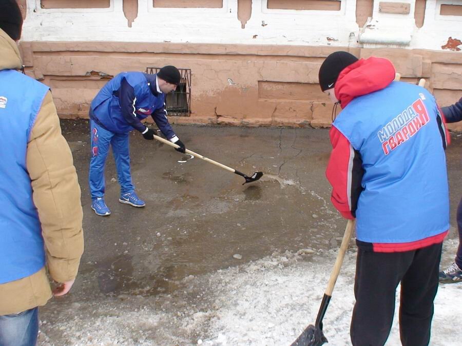 И тут смотрю - на территории соседнего музея человек пятнадцать народу появилось в синих жилетках, с лопатами. На рабочих, которые чистят снег, не похожи. Да и чистит там обычно трактор. Пошел на разведку. Оказывается это ребята из пермского филиала Молодой гвардии Единой России пришли помочь свежевыпавший снег убирать соседнему музею. Чуть больше дюжины человек гребут снег совковыми лопатами и складывают его в кучку. Кто-то гоняет новехонькой лопатой воду в луже. Один счастливчик нашел себе снеговую лопату. С таким инструментом и подходом территорию чистить до утра можно. Она почти гектар. Но задача видимо в другом. С ребятами штук пять телевизионных бригад - снимают красивую картинку и берут интервью. Еще человек пять руководят процессом и фотографируют. - Че вы, говорю, де