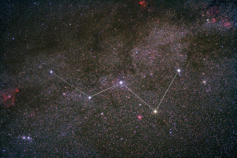 Кассиопе́я (лат. Cassiopeia) — расположено в северном полушарии неба. Ярчайшие звезды Кассиопеи (от 2,2 до 3,4 звездной величины) образуют фигуру, похожую на буквы «М» или «W». Созвездие занимает на небе площадь в 598,4 квадратного градуса и содержит около 90 звёзд ярче 6m (то есть видимых невооруженным глазом). Большая часть созвездия лежит в полосе Млечного Пути и содержит много рассеянных звезд. Созвездие Кассиопея видно практический на всей территории России. Наиболее яркие звёзды Сегин, Рубах, Нави, Шедар и Каф, образующие фигуру W Иначе ведёт себя р Кассиопеи, относимая к классу звёзд-супергигантов (она в 40 раз тяжелее и примерно в 500 000 раз ярче Солнца). Большую часть времени её блеск неизменен и близок к 4m. Но иногда наступают спады блеска до 6,2m, и тогда ρ Кассиопеи становится недоступной для невооружённого глаза. Причиной изменения блеска являются выбросы звездой газа в пространство, которые приводят к ослаблению её видимой яркости. р Кассиопеи - двойная з