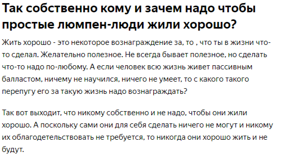 Тут наткнулся на заметку одного гражданина о том, что простые граждане не должны быть счастливыми. И что кому повезло в жизни, абсолютно не должны предпринимать никаких действий для подтягивания на свой уровень менее удачливых бедолаг. Аргументируя это тем, что обычный человек это люмпен не умеющий и не желающий делать свою жизнь лучше. Но однако же смеет желать хорошей жизни и даже где-то считает, что имеет на это право. А счастливчики, кому улыбнулась удача, добились всего в своей жизни сами и никому ничего в этом мире не должны. Вот эту тему я хочу немного мусолить.