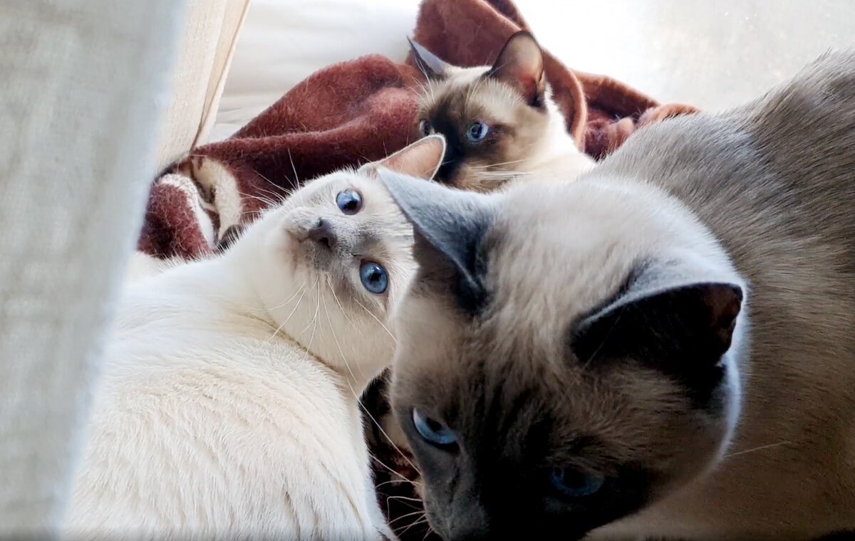 Скромные Тиша и Стёпа и вальяжно развалившийся на белый нахалёнок.