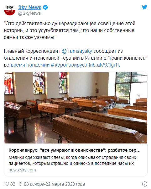 Итальянский врач, лечащий пациентов в центре самой страшной вспышки коронавируса в Европе, выступил с резким предупреждением для других стран, которые еще не пострадали от полной силы пандемии. "Мы знаем, что происходит", - сказала доктор Эмануэла Катеначчи британскому телеканалу Sky News, когда она взяла перерыв от лечения пациентов в палате интенсивной терапии в больнице Кремона в Ломбардии. "Не думайте, что это происходит здесь, и это не может произойти везде ... потому что так и будет. Число погибших в Италии в субботу подскочило с 793 до 4825 человек, что является самым большим ежедневным ростом в абсолютном выражении с момента появления инфекции в стране месяц назад. На прошлой неделе число погибших в результате вспышки болезни в Италии превысило число умерших в Китае, где эта болезнь появилась в конце прошлого года. В то время как Ломбардия, центр итальянской вспышки, была заблокирована в течение нескольких недель, центральное правительство подвергалось критике за то, что оно н