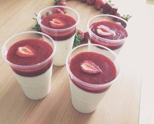 Время приготовления: 30 минут+ охлаждение Порций: 4 Ингредиенты: 500 мл сливок(любой жирности) 200 мл молока 150 гр сахара 10 гр желатина 10 гр ванильного сахара Для соуса: -200 гр клубники -50 гр сахара Приготовление: 1. Замочить желатин на 10 минут в 250 мл воды.Сливки с молоком налить в кастрюлю, добавить смесь из ванильного и обычного сахара,перемешать. Кастрюлю поставить на медленный огонь, помешивая,довести почти до кипения. При появления первых пузырьков, выключить. Добавить желатин к смеси,размешать до полного растворения. Разлить по формам и поставить в холодильник до полного застывания(на 5-10 часов). 2. Для клубничного соуса,с помощью миксера,сделать клубничное пюре,добавить сахар и перемешать. Убрать в холодильник. 3. Готовую,застывшую панна-котту, полить клубничным соусом перед подачей. Приятного аппетита!