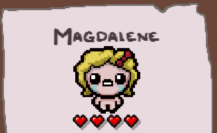 Мэгги открывается довольно просто: в ходе одного забега вы должны накопить 7 контейнеров здоровья. Большинство апгрейдов такого рода добываются при убийстве боссов, но есть и другие способы, к примеру таблетки Health Up, белые сердца и некоторые предметы из магазина, сокровищницы и секретных комнат.