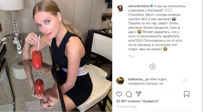Кристина Асмус показала, чем занимается на карантине Известная российская модель и актриса Кристина Асмус продемонстрировала, чем занимается в условиях карантина. Звезда кинематографа на своей страничке в Instagram обратилась к поклонникам с интересным предложением. На фотографии, которую выложила 31-летняя Кристина Асмус, она позирует дома за элегантной стойкой с ягодным коктейлем. Звезда одета в минималистический черный спортивный топ и такие же шорты. Образ дополняют собранные в хвост волосы, и при этом Кристина неброско накрашена, что выгодно подчеркивает ее природную красоту. "А как вы относитесь к рекламе у блогеров? Спокойно, бесит, иногда полезно, смотря чего и как сделана? Пишете ли им "фу, заебл! Опять реклама! Зачем продался, гори в аду!" Может радуетесь, что у кого-то возможность заработать есть? Отписывались ли от кого из-за рекламы в инстаграм или пофиг, вам не жалко?" - спросила Кристина Асмус у своих подписчиков. В последнее время звезда экранов активно развивает св