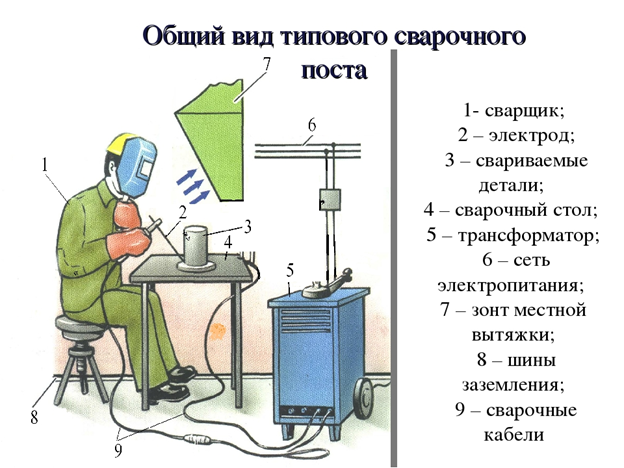 Для начала нужно подготовить рабочее место. Безопасности при работе с электросваркой необходимо уделять повышенное внимание: тут есть возможность получить травму от электричества, и высокой температуры! Учится варить электросваркой удобнее на толстом куске металла. Кроме него и сварочного аппарата, понадобятся краги (толстые перчатки), маска сварщика. Также необходима плотная одежда, защищающая все тело. Она должна выдерживать попадание искры и окалины. Нужна будут также молоток и металлическая щетка для того, чтобы сбивать шлак. Для защиты глаз при этом нужны будут очки. По безопасности разобрались, идем дальше… Сварочные работы для начинающих проще будет проводить, если взять универсальный электрод диаметром 3,2 мм. Электрод вставляется в держатель, закрепленный на одном из сварочных кабелей. Есть два типа фиксаторов — пружинный и винтовой. Если держатель электрода пружинный, нажимаете на клавишу на ручке и в появившееся гнездо вставляете электрод. На сварочном аппарате постоя