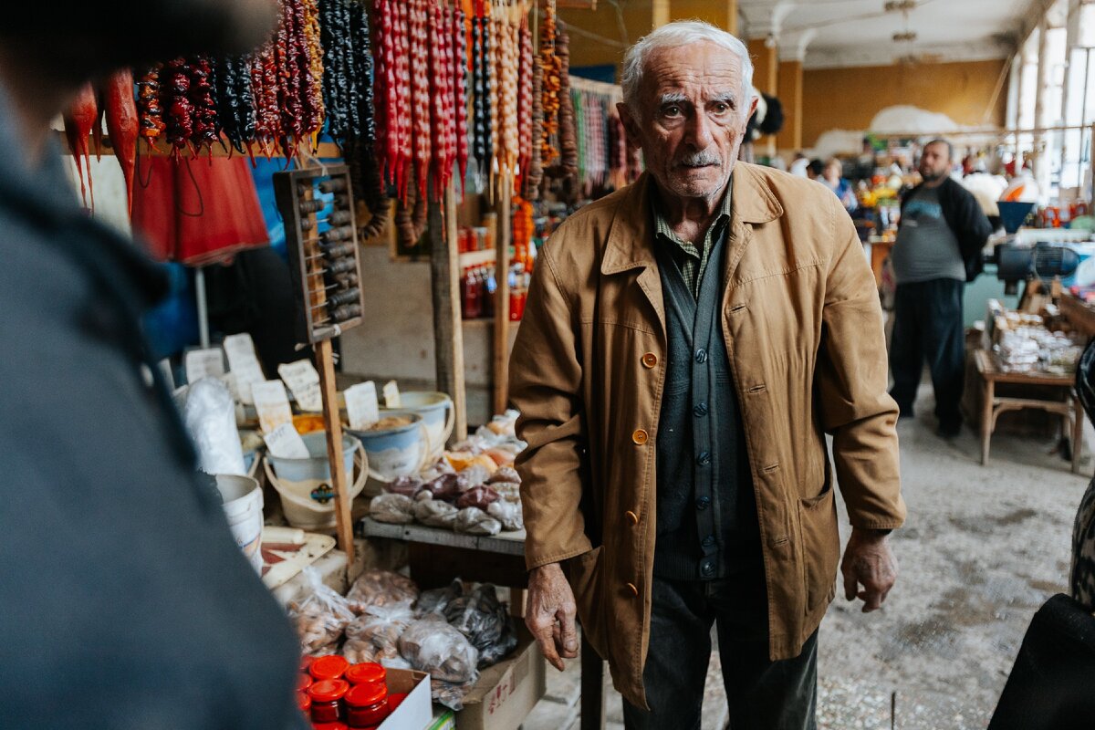 У дедушки Серго - ещё и паркинсон, и он стесняется. Когда на рынок заходит группа, она быстро попадает в оборот к более активным владельцам прилавков.