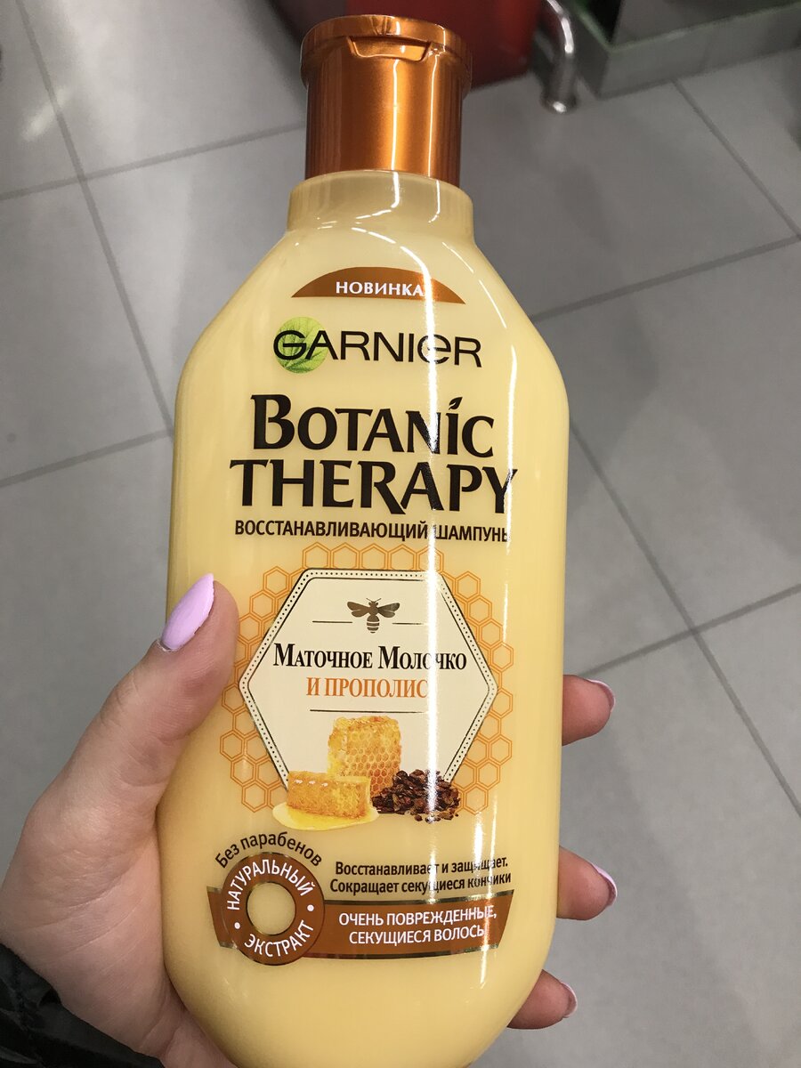 Всем привет! Сегодня рассказываю о нереально крутом шампуне! Шампунь Garnier Botanic Therary с прополисом и маточным молочком. Купить его можно в любом супермаркете вашего города...но я люблю скидки, поэтому жду очередную скидку в магазине Перекресток и с радостью и счастливыми глазами покупаю:) Дизайн флакона интересный и яркий, выполнен из бежевого полупрозрачного пластика. На флаконе изображены мёд с пчелками На обратной стороне имеется вся полезная и нужная информация о свойствах данного шампуня, о пользе прополиса и многое другое. На шампуне имеется удобная открывающаяся крышечка в коричневом цвете. Дозатор удобный, лишнее количество не вытечет. Цвет шампуня светло-бежевый, приятный, нежный. В аромат этого шампуня я сразу влюбилась! Консистенция шампуня довольно жидкая, наносить на волосы нужно сразу. Пенится хорошо. После применения шампуня Гарнер прополис и маточное молочко волосы стали рассыпчатые и блестящие!!! Этот шампунь творит чудеса. После занятия спортом на заты