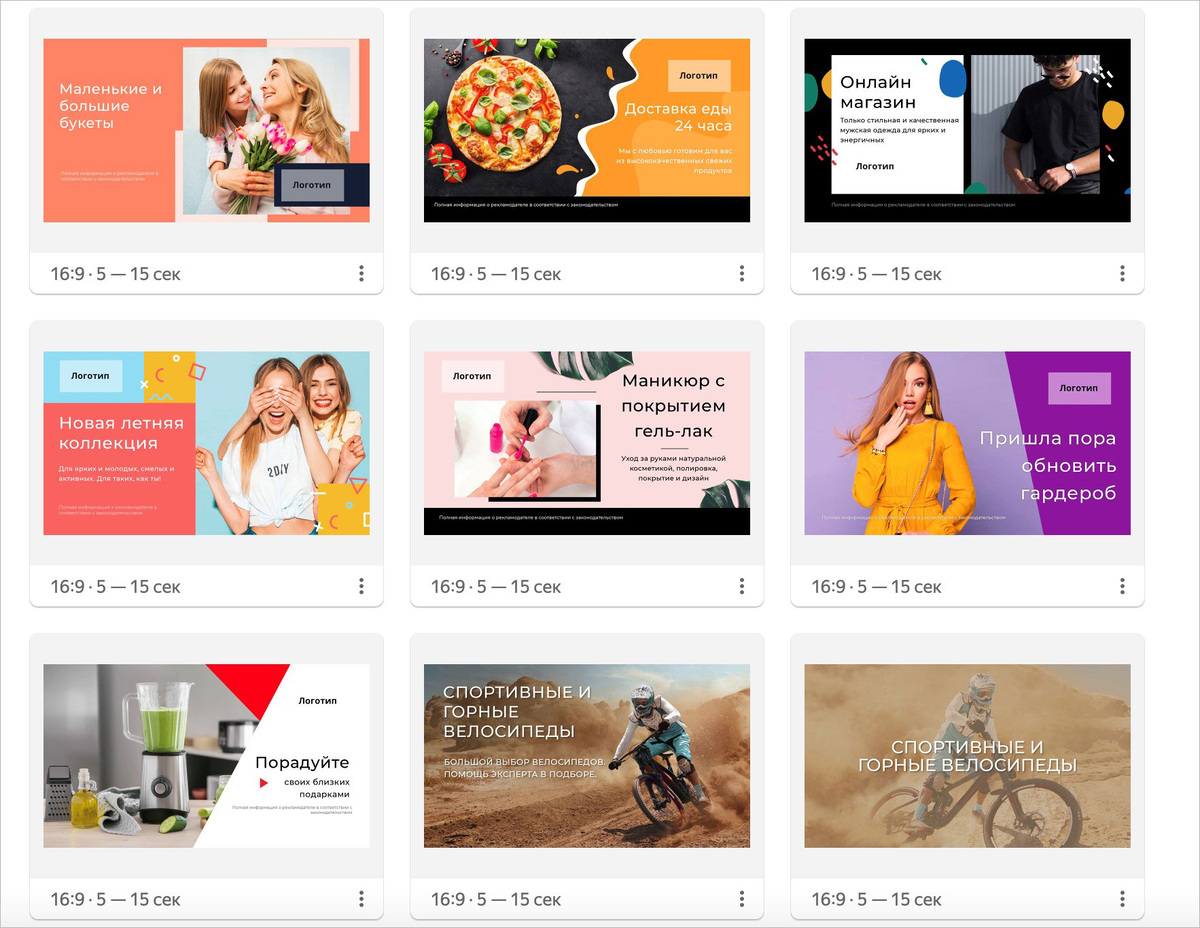 Помимо грамотных настроек, для эффективной онлайн-видеорекламы важен качественный ролик. Теперь вам будет гораздо проще создать такой: в открытую бету в Яндекс.Директе выходит новый инструмент — видеоконструктор. В нём вы можете быстро и легко создавать видеоролики с нуля на основе библиотеки шаблонов. Сегодня мы открыли видеоконструктор в интерфейсе для некоторых пользователей, а до конца марта он будет доступен уже всем. Видеоконструктор пригодится, если у вас нет ресурсов на съемку и монтаж роликов — они создаются из статичных изображений. Такие ролики подойдут как для медийной, так и перформанс-рекламы в Директе. При этом использовать внешние программы или искать нужный формат файла будет не нужно — видео из конструктора автоматически подгружается в библиотеку видеороликов. В инструменте доступно 15 универсальных шаблонов, которые подходят под разные тематики: В шаблонах вы можете менять анимации слайдов и их наполнение: тексты, картинки, лого и цвета и многое другое. Кроме этог
