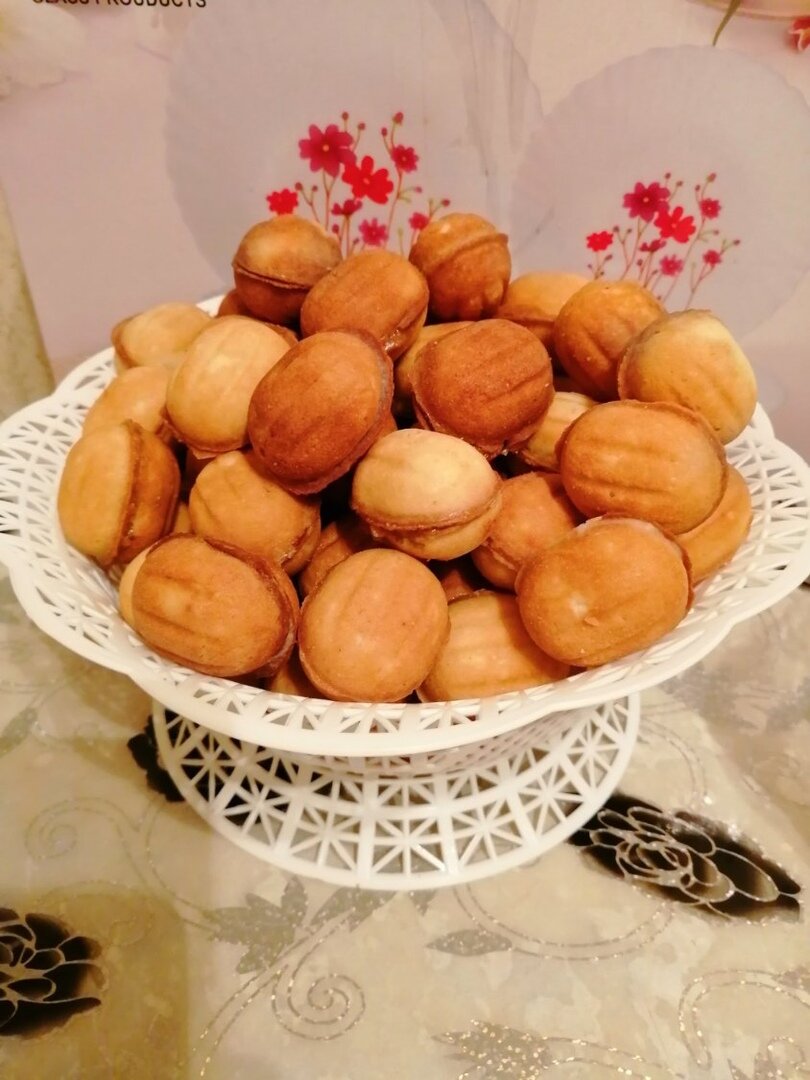 3. С готовых печений срежьте излишки, растолките в крошку и добавьте с сгущенке.(еще тут очень не помешают молотые грецкие или любые другие орехи) Полученным кремом начините половинки орешков и соедините их попарно.