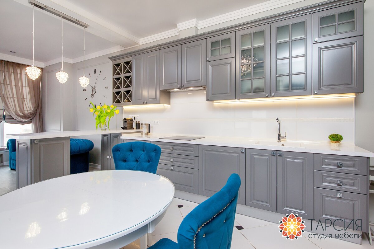 Современная классика кухонь в текущем понимании похожа на американские интерьеры, но у нас они сильно адаптированы. * Основные характерные черты и преимущества кухни в стиле неоклассика: ⠀ ✅ Матовые фасады с фрезеровкой — основа основ стиля неоклассика на кухне. Если фрезеровку убрать, интерьер станет просто современным. Глянец тяжело вписать — лучше не рисковать. ⠀ ✅ Актуальная встраиваемая техника без винтажных имитаций. Больше выбор, меньше цена, естественно выглядит — нет смысла косить под классику. ⠀ ✅ Верхние шкафы до потолка. Делать кухню под потолок уже стандарт для 2019 года. В неоклассике это можно реализовать дополнительными секциями по принципу антресоли, прозрачным створками как в буфете, или стандартно опустив потолок в зоне шкафов. Заодно скроет отвод вытяжки в вентканал. ✅ Все формы гарнитура подходят для неоклассики: угловая, п-образная, прямая — без разницы. Но угловую мойку делать не стоит — выглядит как из 90-х. ⠀ ✅ Светлые тона, встроенность и монолитность всей меб