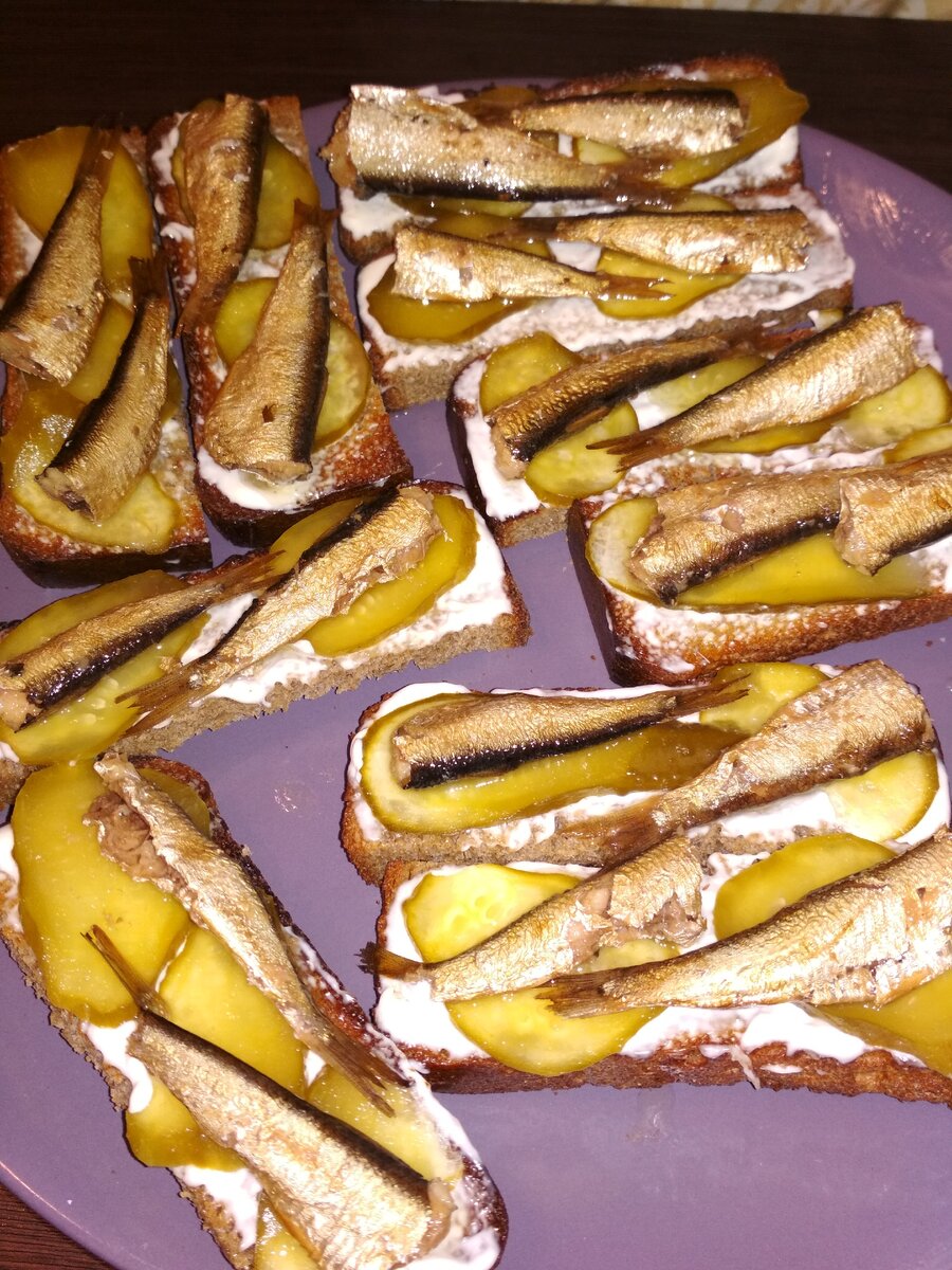 Поверх майонеза выкладываем дольку соленого огурчика, а сверху - одну шпротину. В итоге у нас получится 10 бутербродов. Можно украсить их веточкой петрушки. Готово! Я еще готовлю следующие вариации: За основу так же берем-хлеб с чесноком и майонезом, добавляем: 1. Шпроты, болгарский перец. Перец нарезать соломкой. 2. Отварное яйцо, шпроты, свежий помидор. Яйц