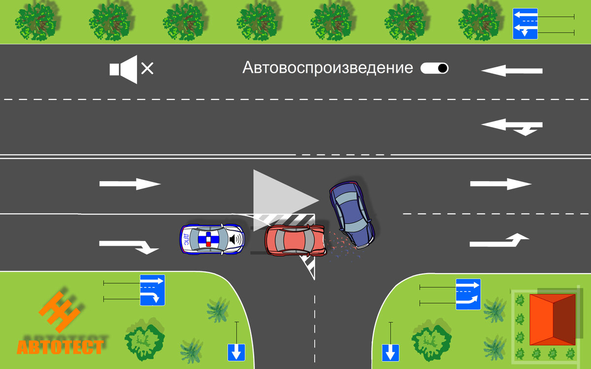 Приветствую всех подписчиков и гостей канала АвтоТест. Перед вами, как всегда, представлен анимационный ролик с ДТП, в котором предлагаю найти виновника аварии. Посмотрите на него внимательно, прочитайте условия задачи, и дайте правильный, как вам кажется, ответ. Я, в свою очередь, оставлю своё мнение под анимацией, а всех согласных и несогласных жду в комментариях. И так поехали! Задача! На анимации представлена загородная трасса с Т-образным перекрёстком. В противоположных направлениях едут синий и красный автомобили. Синяя машина намерена свернуть на примыкающую дорогу с односторонним движением, пропуская встречную жёлтую машину, начинает выполнять поворот. В этот момент, в противоположном направлении, красная машина едет в полосе, предназначенной для поворота направо, но продолжает движение прямо. Пути автомобилей пересеклись и произошла авария. Кто, на Ваш взгляд, виновник ДТП? 1. Синяя машина 2. Красная машина 3. Обоюдная вина Мнение автора: чтобы дать правильный ответ, давай