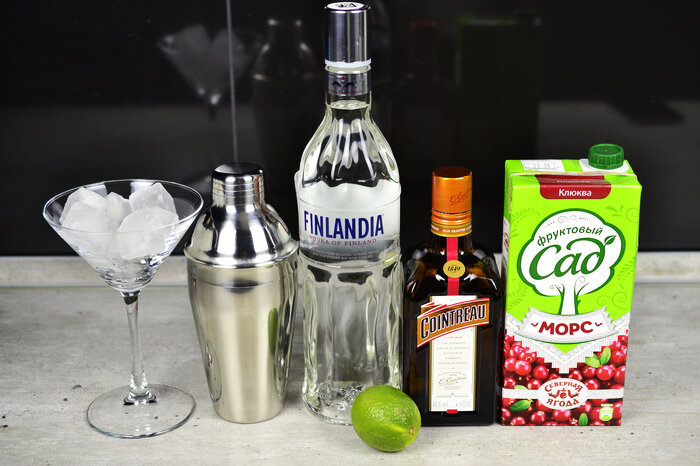Всем понятно, что моду в мире коктейлей диктует Голливуд. Давным давно когда вышел фильм Вуди Аллена «Манхэттен», то сразу стал популярным коктейль с одноименным названием. Джеймс Бонд подсадил народ на «Мартини-водка». Герой комедии «Большой Лебовски» любил «Белый русский», результат тот же: в барах всего мира после проката фильма стали спрашивать «русского». Четыре подружки из популярного американского сериала «потерушки в большом городе» обожали «Космополитен». Кстати, и сегодня это самый популярный московский женский коктейль. Его и приготовим! В общем нам понадобятся ингредиенты: 1)Водка, её нам понадобится 40 мл. 2) Ликер, у меня Куантро - 15 мл 3) Сок лайма, или если вы не мажоры как я, то подойдет и лимонный сок, его нам понадобится 10 мл 4)Сок клюквенный, у меня морс :-), его понадобится 30 мл. (если как я рискнете и покупаете его в магазине, то следите, что бы в составе не было виноградного сока, а то коктейль будет не очень) 5) Большое количество льда, заранее сделайте